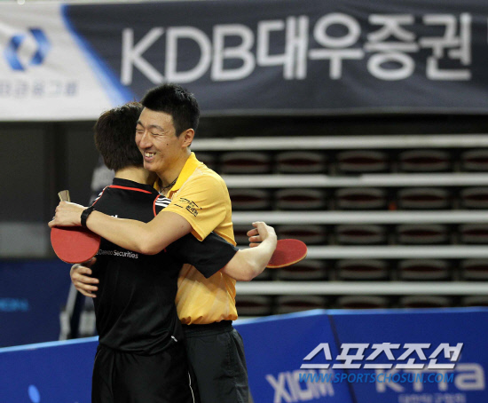 ◇정영식의 남자단식 우승이 결정된 직후 선배 오상은이 정영식을 안아주며 따뜻한 축하인사를 건네고 있다. 사진제공=월간탁구 안성호 기자