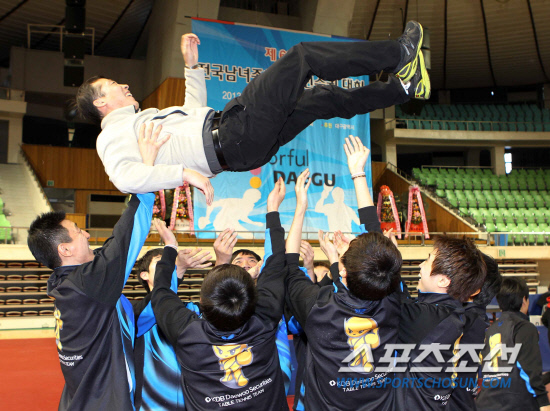 ◇대우증권 선수들이 남자단체전 남자단식 남자복식에서 3관왕에 오른 후 김택수 감독을 행가레치고 있다. 사진제공=월간탁구 안성호 기자