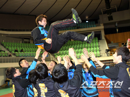 전국남녀탁구종합선수권에서 단체전 우승, 남자복식 우승 , 남자단식 우승 등 최고의 성적을 거둔 대우증권 선수들이 단식우승자 정영식을 헹가래치며 기뻐하고 있다. 사진제공=월간탁구 안성호 기자