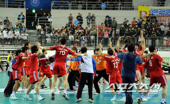 | ◇2013년 스페인 세계선수권에 나서는 남자 핸드볼 대표팀의 첫 관문은 세르비아전이다. 지난 2011년 11월 2일 서울 방이동 SK핸드볼전용경기장에서 열린 2012년 런던올림픽 아시아지역 예선 결승전에서 남자 대표팀이 일본을 꺾은 뒤 환호하고 있다. 스포츠조선DB |