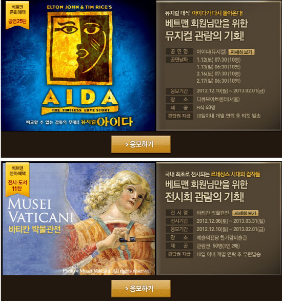 먼저 연말 가족이 함께 즐길 수 있는 '아이다' 뮤지컬 관람권을 제공하는 컬처라운지 공연 25탄이 오는 다음달 2월 1일까지 진행중이다. 벳볼 300개 이상을 보유한 베트맨 회원은 베트맨 홈페이지 컬처라운지 이벤트 페이지에서 누구나 응모할 수 있다. 당첨된 회원에게는 디큐브아트센터에서 열리는 '뮤지컬 아이다' R석 관람권(40명)을 증정한다.