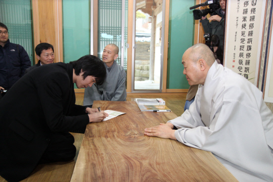 ◇이세돌 9단이 해인사 주지인 선해 스님(오른쪽) 앞에서 팔만대장경 보존회원에 가입했다.