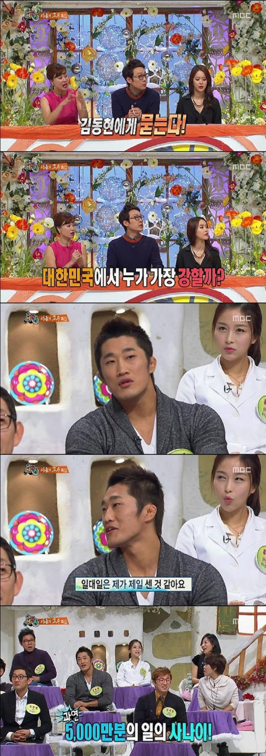 김동현은 한치의 망설임도 없이 "1대1은 제가 가장 센 것 같다"고 말해 출연진들의 탄성을 자아냈다. 조혜련이 놀란 표정으로 "대한민국에서?"라고 재차 묻자 김동현은 "1대1은 자신있다"고 힘주어 말했다.
