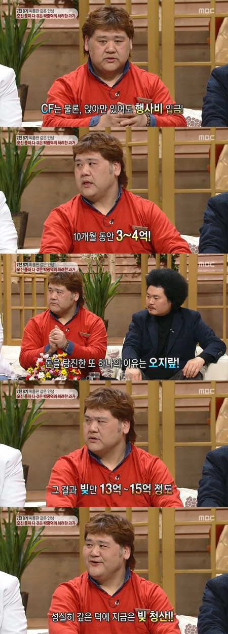 이날 박광덕은 "방송 출연 후 CF 등을 통해서 돈을 많이 벌었다. 행사 같은 것은 앉아만 있어도 행사비가 들어왔다"며 "그야말로 별천지였다. 당시 10개월 동안 3~4억 원은 벌었던 것 같다"고 말했다.