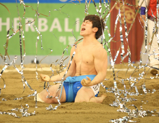 | ◇최정만이 9일 전북 군산 월명체육관에서 열린 2013년 설날장사씨름대회 금강장사 결정전에서 우승을 확정지은 뒤 환호하고 있다. 사진제공=대한씨름협회 |