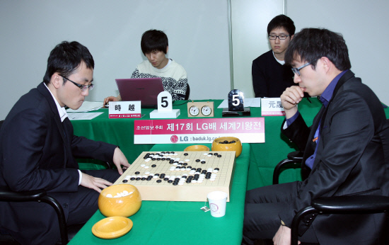 ◇결승2국 대국 장면. 중국의 스웨 5단(왼쪽)이 원성진 9단에게 2-0으로 승리하며 세계대회 첫 우승에 성공했다.