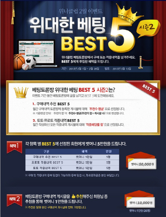 스포츠토토의 공식 온라인 발매사이트인 베트맨이 위너클럽 2월 이벤트 '위대한 베팅 BEST5 시즌2'의 마감이 임박했다.