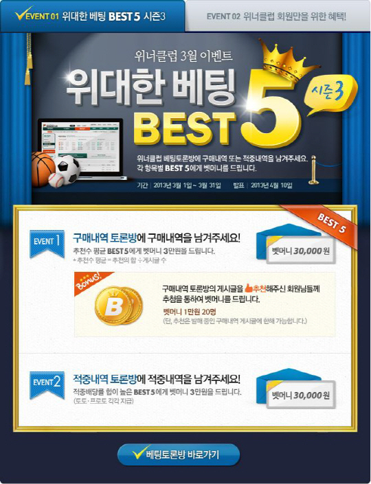 국민체육진흥공단(www.kspo.or.kr)이 발행하는 국민체육진흥투표권 수탁사업자인 스포츠토토의 공식 온라인 발매사이트인 베트맨(www.betman.co.kr)이 위너클럽 3월 이벤트 '위대한 베팅 BEST5 시즌3' 이벤트 개시 10여일 만에 조회수 5000건(10일 오전 9시 기준 5792건)을 돌파하는 등 토토 팬들의 뜨거운 호응을 얻고 있다.