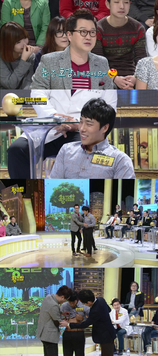 특히 김동성이 구리빛의 탄탄한 복근을 공개하며 '식스팩'을 보이자 스튜디오는 술렁였고, 안선영, 오영실 등 여성 패널들은 화들짝 놀라며 입을 다물지 못했다. 안선영은 "여기가 마장동 우시장도 아니고 부위별로 보여주면 어떡하느냐'며 너스레를 떨었다.
