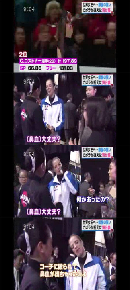 지난 17일(한국시각) 시상식이 시작되기 직전 한 곳에 모여 대기하고 있던 1위 김연아, 2위 카롤리나 코스트너, 3위 아사다 마오는 서로 악수하며 인사를 나눴다. 카롤리나와 악수를 하던 아사다는 프리스케이팅 직전 코피를 흘렸던 카롤리나에게 "(코피) 괜찮아?"라고 조심스레 질문했고, 이에 옆에 있던 김연아는 영어로 "긴장했어?"라고 물었다.