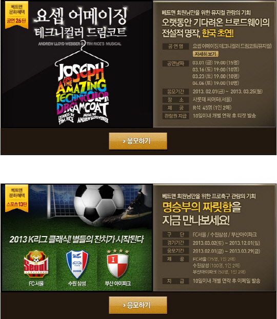 또 2013년 K-리그 클래식 경기를 관람할 수 있는 입장권을 제공하는 컬쳐라운지 이벤트 스포츠 13탄이 오는 29일까지 진행 중이다. 응모자 가운데 총 225명을 추첨해 FC서울(75명), 수원삼성(100명), 부산아이파크(50명)의 홈경기 입장권을 나눠준다.