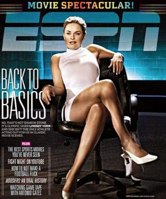 뿐만 아니라 린지 본은 2010년 스포츠 매거진 'ESPN'의 표지 모델로 등장했을 당시에도 영화 '원초적 본능'의 샤론 스톤 뺨치는 섹시미를 선보여 시선을 모았다. 볼륨감 넘치는 몸매가 드러나는 화이트 원피스에 올백머리, 다리를 꼰 아찔한 포즈까지 완벽하게 샤론스톤으로 변신한 모습으로 놀라움을 자아낸다.