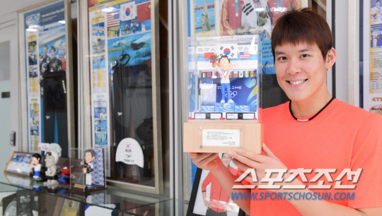 ◇박태환은 자신의 뒤를 든든하게 지켜주는 팬들에 대한 고마움을 잊지 않고 있다. 팬클럽이 선물한 베이징올림픽 금메달 피규어를 들어보이며 활짝 웃었다. 최문영 기자 deer@sportschosun.com