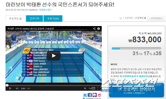 팬들이 스스로 모금 운동에도 나섰다. 25일 크라우드 펀딩 회사인 유캔펀딩 사이트(ucanfunding.com)에는 '마린보이 박태환 선수의 국민스폰서가 되어주세요!'라는 타이틀의 프로젝트가 올라왔다. '크라우드 펀딩'(crowd funding)은 사회 공익프로젝트를 인터넷 등을 통해 공개하고 일정 기간 목표 액수를 정한 뒤 익명의 다수로부터 모금하는 방식이다. 자신을 '오랫동안 박태환을 응원해온 팬'이라고 소개한 프로젝트 등록자는 '박태환이 다시 한번 일어날 수 있도록 모두 함께 국민 스폰서가 돼달라'고 제안하고 있다. 목표금액은 500만원이다. 프로젝트를 올린 직후 80만원 이상이 모금됐다. '올림픽 종목 중 유일하게 챙겨보는 종목이 수영이다''제가 기억하는, 기억할 최고의 수영선수다. 작은 금액이지만 힘이 되고 싶다'등 팬들의 응원 댓글이 줄을 이었다.
