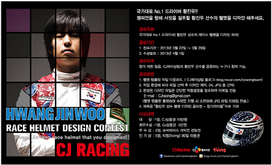 CJ레이싱팀이 소속팀 톱드라이버 황진우의 새로운 헬멧 디자인을 공모한다.