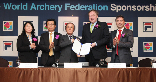 휠라코리아(주)(대표 윤윤수)는 28일 서울 소공동 롯데호텔에서 세계양궁연맹(회장 우구르 에르데너)과 후원 협약식을 개최했다. 휠라는 2016년 브라질 올림픽까지 4년간 세계양궁연맹이 주관하는 월드컵, 그랑프리 등 모든 행사에 공식 후원사로 활동한다. 또 세계양궁연맹의 심판, 임원 및 스태프에게 유니폼도 지원하게 된다.