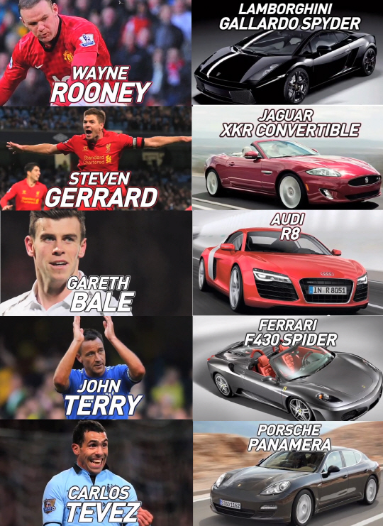 가레스 베일의 아우디 R8과 스티븐 제라드(리버풀)의 재규어 XKR 컨버터블이 각각 2위와 3위에 오른 가운데, 1위엔 웨인 루니의 람보르기니 갈라르도 스파이더로 꼽혔다.