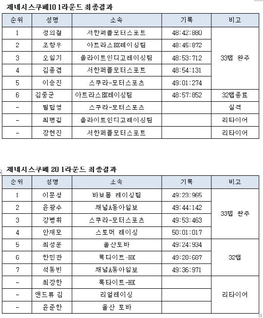 정의철은 21일 전남영암 코리아인터내셔널서킷내 상설 트랙(1주 3.03㎞)에서 열린 제네시스쿠페10 클래스에서 총 33바퀴(약 100㎞)를 48분42초880에 달려 가장 먼저 결승선을 통과했다.
