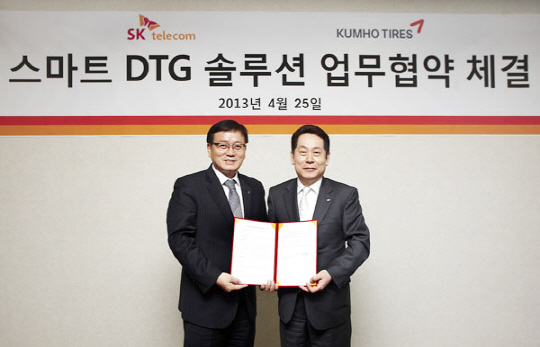 금호타이어가 SK텔레콤과 디지털운행기록계(DTG·Digital Tachograph, 이하 DTG) 사업 제휴 업무협약을 체결했다.