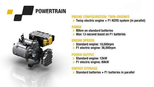 특히 트위지는 뒷좌석 부분에 르노의 F1 기술로 만들어진 KERS 시스템이 탑재됐다. 이 시스템은 최대 13초 동안 '트위지'의 출력을 17마력에서 100마력으로 거의 6배 가까이 부스트업 시킨다. KERS는 브레이킹에서 발생한 열 에너지를 운동 에너지로 저장했다가 순간적인 엔진출력 향상에 이용하는 기계적 에너지 회생 시스템이다.