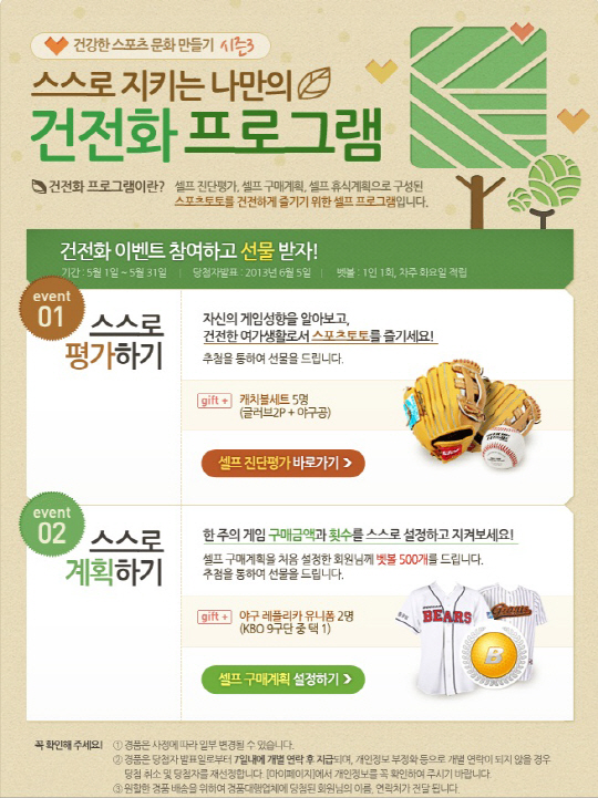 이번 캠페인 기간 동안 셀프진단평가에 참여한 회원들 중 추첨을 통해 5명에게 야구 캐치볼세트(글러브 2p+야구공)를 증정한다.