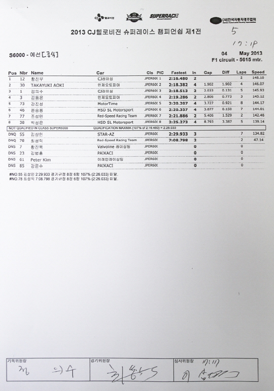대회 최고 클래스인 슈퍼6000(6200cc) 클래스에서는 올시즌 CJ레이싱팀으로 이적한 황진우가 첫 랩에서 2분 16초 480으로 가장 빠른 기록을 내며 예선 1위를 차지했다.