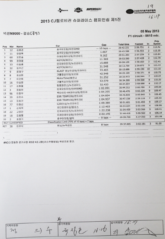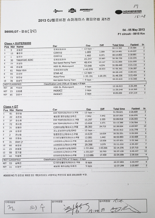 그리고 10랩에서 황진우가 팀 동료인 김의수를 제치면서 2위로 올라섰고 그대로 순위를 굳히면서 경기를 마쳤다.