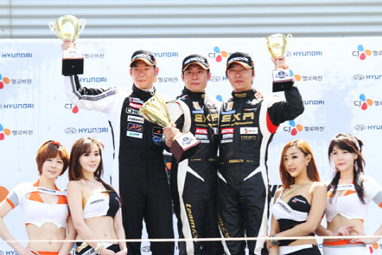 슈퍼레이스 개막전 GT클래스 입상자들 2위 김진표, 1위 정연일, 3위 장순호(왼쪽부터).