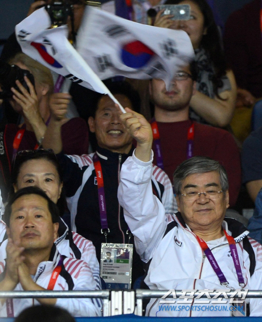 ◇조양호 대한탁구협회장(오른쪽)이 2013년 국제탁구연맹 이사회에서 특별자문위원으로 선임됐다. 세계 탁구발전에 기여한 공로와 진정성을 인정받았다. 사진은 지난해 런던올림픽 현장에서 태극기를 흔들며 탁구선수들을 응원하고 있는 조양호 회장. 사진=런던올림픽공동취재단