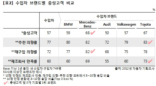 BMW와 폭스바겐은 각각 59%, 57%로 수입차 전체와 비슷한 수준이었으며, 아우디는 50%로 가장 낮았다. 추천의향률과 제조회사 만족률은 토요타(각각 83%, 73%), 재구입 의향률은 Benz(82%)가 가장 높았다.