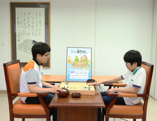 ◇신진서(13·오른쪽) 초단과 신민준(14) 초단이 제13회 한화생명배 세계어린이 국수전 개최를 축하하는 기념 대국을 펼치고 있다.