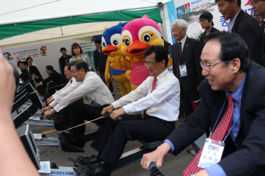 특히 이날 여러가지 이벤트가 펼쳐졌다. 도정희망의 레이스, 대회성공결의 소원쪽지 매달기 등이다. 도정희망의 레이스는 조정체험기구인 에르고미터를 100m 당기면 100원이 기부되는 기부프로그램으로 조직위원들의 체험이 줄을 이었다.