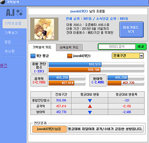 이번에 제공되는 '기력진단서비스'는 게임 이용자의 대국내용을 분석해 개개인의 바둑 실력을 알려주는 서비스로, 개인의 바둑성향은 물론이고 장단점까지 한눈에 파악할 수 있게 된다.
