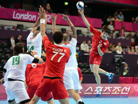 ◇정의경(오른쪽)이 지난해 7월 31일(한국시각) 영국 런던 올림픽파크 핸드볼경기장에서 열린 한국-헝가리 간의 2012년 런던올림픽 남자부 경기에서 슛을 시도하고 있다. 런던=올림픽사진공동취재단