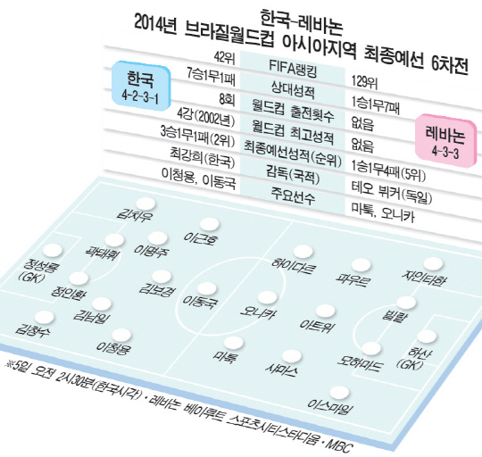 최강희호가 5일 오전 2시30분 베이루트 스포츠시티스타디움에서 레바논과 충돌한다. 2014년 브라질월드컵 아시아지역 최종예선 A조 6차전이다. 한국은 레바논전에 이어 안방에서 11일 우즈베키스탄(오후 8시·서울)과 7차전, 18일 이란(오후 9시·울산)과 최종전을 치른다.