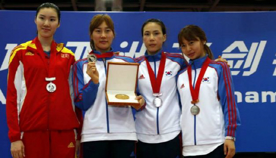 여자 플뢰레의 전희숙(왼쪽에서 두번째)이 아시아선수권 2관왕에 올랐다. 개인전에 이어 단체전 금메달도 목에 걸었다. 개인전 동메달리스트 정길옥 김미나와 단체전 금메달을 획득했다. 사진은 지난 4일 개인전 시상식 모습.
