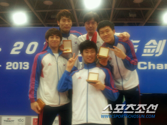 ◇고 진 코치(뒷줄 가운데)가 이끄는 남자 플뢰레 대표팀 허 준 김민규 손영기 하태규가 8일 상하이아시아선수권에서 중국과 일본을 연파하며 우승했다. 허 준(왼쪽 끝)은 개인전 우승에 이어 단체전에서도 우승했다. 손목 부상으로 컨디션 난조를 겪었지만 동료들의 파이팅과 끈끈한 팀워크에 힘입어 2관왕에 올랐다.