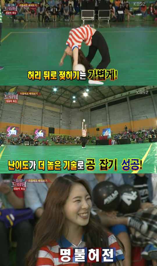 9일 방송된 KBS 2TV '출발드림팀 시즌2'에서는 그룹 엠블랙(승호, 지오, 이준, 천둥, 미르)과 세종고등학교 여자 체조부의 리듬체조 릴레이 경기가 펼쳐진 가운데 세종고 선배인 신수지가 깜짝 등장했다.