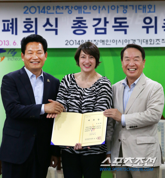 ◇2014인천장애인아시안게임 개폐회식 총감독에 선임된 박칼린 감독(가운데)이 10일 오전 인천시청 시장접견실에서 송영길 시장(왼쪽)과 김성일 조직위원회 위원장과 위촉장을 들고 활짝 웃고 있다.