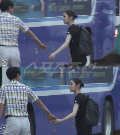 사진은 21일부터 23일까지 3일 동안 서울 올림픽공원 체조경기장에서 열린 '삼성 갤럭시★스마트에어컨 올댓스케이트 2013' 아이스쇼를 마친 김연아가 버스 앞에서 아버지와 손을 잡고 건물 안으로 들어가는 모습을 담고 있다.