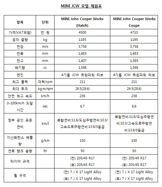이들 미니 JCW 모델의 가격은 부가세를 포함해 △미니 JCW 해치백 4500만원 △미니 JCW 쿠페4710만원 등이다.