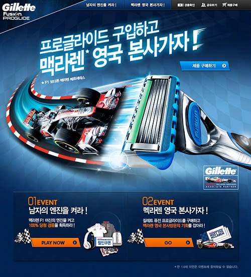 면도기 브랜드 질레트가 맥라렌 F1팀과의 제휴를 기념하기 위해 '프로글라이드 구입하고 맥라렌 영국 본사가자!' 이벤트를 9월까지 실시한다고 밝혔다.