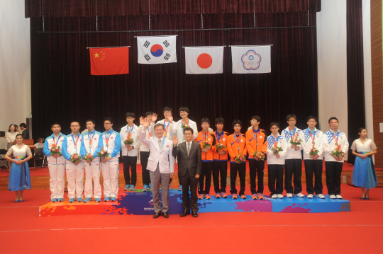 ◇남자단체전에서 금메달을 획득한 한국 대표 선수단이 단상의 가장 높은 자리에 올랐다. 왼쪽부터 이동훈, 변상일, 강승민, 나현. 사진 앞쪽은 시상을 맡은 서대원 아시아바둑연맹 회장(왼쪽)과 양재호 한국기원 사무총장.