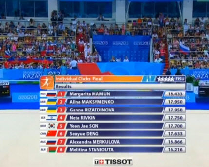 결선 포디움의 긴장감은 세계 최강 에이스에게도 마찬가지였다. 손연재에 앞서 출전한, 개인종합, 후프 금메달리스트이자 유력한 우승후보였던 마르가리타 마문(18)이 마무리 동작에서 수구를 놓치는 큰 실수를 범했다. 음악이 끝나는 마지막 동작에서 볼을 놓쳤다. 마문이 받지 못한 볼은 포디움 선밖으로 또르르 굴러나갔다. 볼을 놓친 채로 연기를 마쳤다. 17.000점, 8명 가운데 최저 점수를 받아들었다. 대이변이었다.