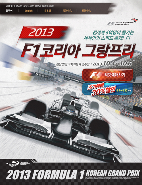 할인이 적용되는 F1티켓은 R등급(메인그랜드스탠드)으로 전일권, 일요일권, 토요일권이 해당되며 티켓을 제시하면 1회에 한해 할인혜택을 받을 수 있다.