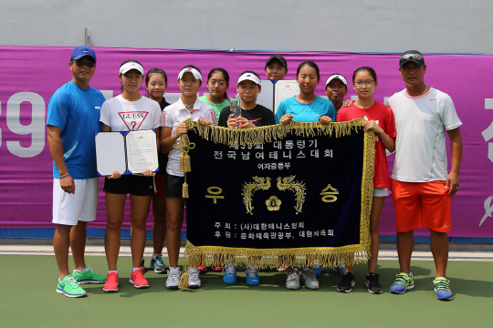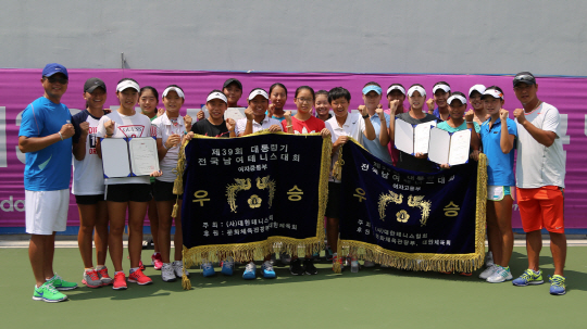 18일 오전 10시부터 구미 금오테니스장에서 열린 대회 여자고등부 단체 결승전에선 중앙여고 A, B팀이 맞붙었다. 이날 A팀 김다혜는 B팀 박소연를 2대0으로, A팀 현한비는 B팀 박예림을 2대1로, A팀 권미정은 B팀 이지은을 2대0으로 꺾었다. A팀은 종합전적 3대0으로 B팀을 완파, 대회 3연패를 달성했다.