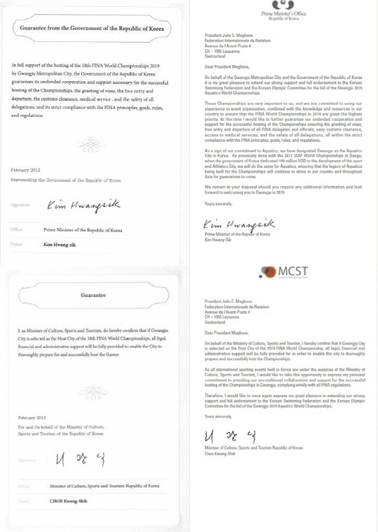 문체부에 따르면, 정부는 올해 2월 말 '세계수영선수권대회유치위원회'(이하 대회유치위)에 국무총리와 문체부장관의 정부보증서를 발급했고, 대회유치위는올해 4월 2일 국제수영연맹(FINA)에 유치신청서를 제출하면서 조작된 정부보증서를 첨부했다. 이후 지난 5월1일 국제수영연맹 실사단 방한시 총리 면담을 앞두고 관련자료를 검토하면서 조작된 정부보증서가 발견됐고(2013. 4. 26), 문체부는 즉시 대회유치위에 조작된 정부보증서를 원래 정부보증서로 교체할 것을 요구했다. 당시 문체부는 대회유치위가 국무총리와 국무위원의 서명을 도용해, 정부가 발행한 보증서와는 완전히 다른 별개의 문서를 새롭게 작성해 국제수영연맹에 제출한 행위는 매우 중대한 범죄행위이며 대회유치위에 대한 사법 당국 고발조치와 동 대회에 대한 재정 원 불가라는 문체부의 공식 입장을 통보한 바 있다.