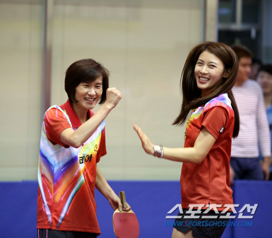 20일 경기도 군포 농심탁구단 훈련장에서 '코리아' 탁구단 창단식이 열렸다. 1991년 지바세계탁구선수권 남북단일팀을 다룬 영화 '코리아'의 배우, 스태프들이 남북체육교류를 위한 탁구단으로 다시 뭉쳤다. 창단식 후 친선 복식경기에서 현정화 대한탁구협회 전 전무와 하지원이 공격 성공 후 환호하고 있다. 사진제공=월간탁구 안성호 기자