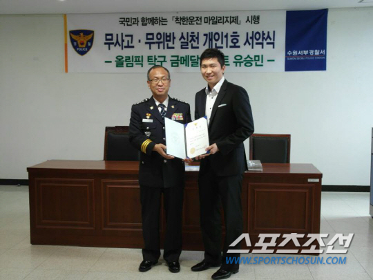 수원서부경찰서는 24일 2004년 아테네올림픽 남자탁구 단식 금메달리스트인 유승민 선수를 4대 사회악 근절 홍보대사에 임명했다. 4대 사회악은 '가정폭력, 성폭력, 학교폭력, 불량식품'이다. 범죄로부터 안전한 사회구현을 위한 4대 사회악 척결 노력에 적극 동참을 약속했다. '국민과 함께하는 착한운전 마일리지제' 무사고 무위반 실천 개인 1호 서약식도 가졌다. 위촉식에는 김정섭 수원서부경찰서장 및 경찰 관계자, 유승민과 부인 이윤희씨 등이 참석했다.