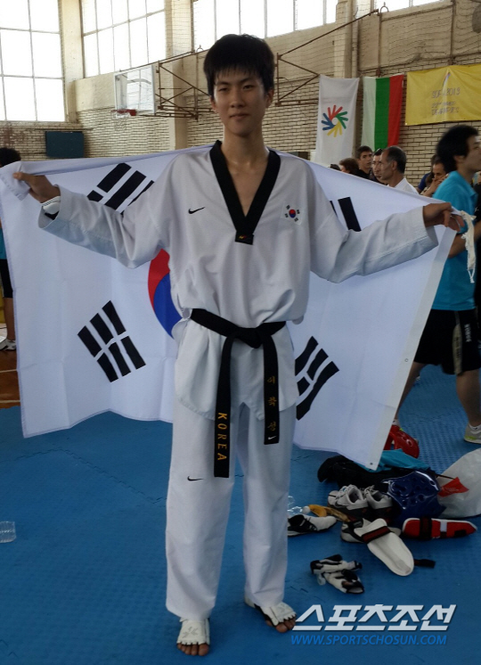 28일 소피아 국립스포츠아카데미에서 열린 농아인올림픽 태권도 겨루기 80kg급에서 이학성이 금메달을 딴 후 태극기로 어깨를 감싼 채 세리머니를 하고 있다.
